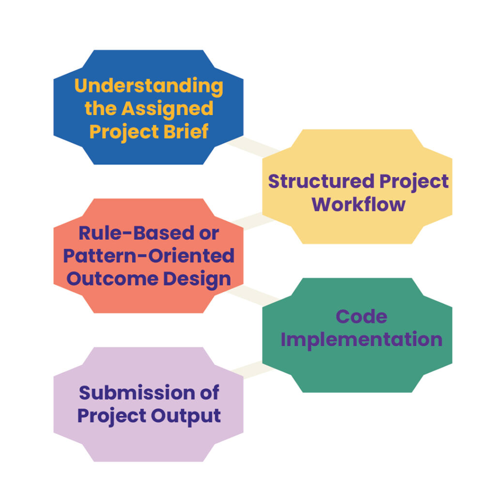 Participants progress through a sequence of interconnected tracks that evaluate clarity of interpretation, coding precision, and problem-handling through guided project design.